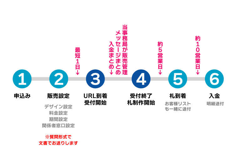申し込みから最短1日で受付開始可能だから、間もなく本番を迎える公演・イベントでも導入可能。演劇、音楽ライブ、お笑い、撮影会、オフ会等に適しています。