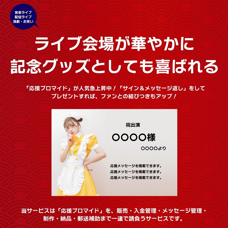 - お客様ごとの完成イメージをWEBにアップし、ご担当者様に、管轄のタレント様が販売したものをすべてアップしますので、不適切なメッセージがあればNGを出すことができます。NGは当事務局よりお客様にメッセージの送り直しをお願いします。締め切り前後でNGとなった場合は納品までの作り替えが間に合わない可能性がありますので、「ご出演おめでとうございます」といった基本メッセージに変更となります。(お客様にはその可能性があることをお伝えしたうえで販売します)。NGメッセージの具体的内容やルールについては販売時に注意書きとしてお客様にお伝えしておくことをお勧めします。